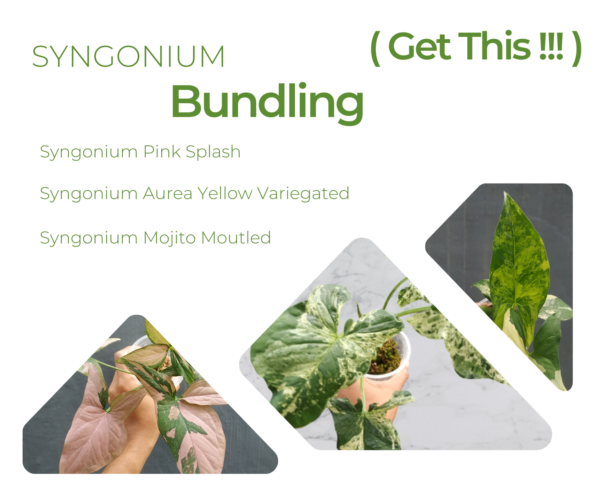 Syngonium Mojito Mottled, Syngonium Pink Splash, Syngonium Aurea Yellow Variegated
